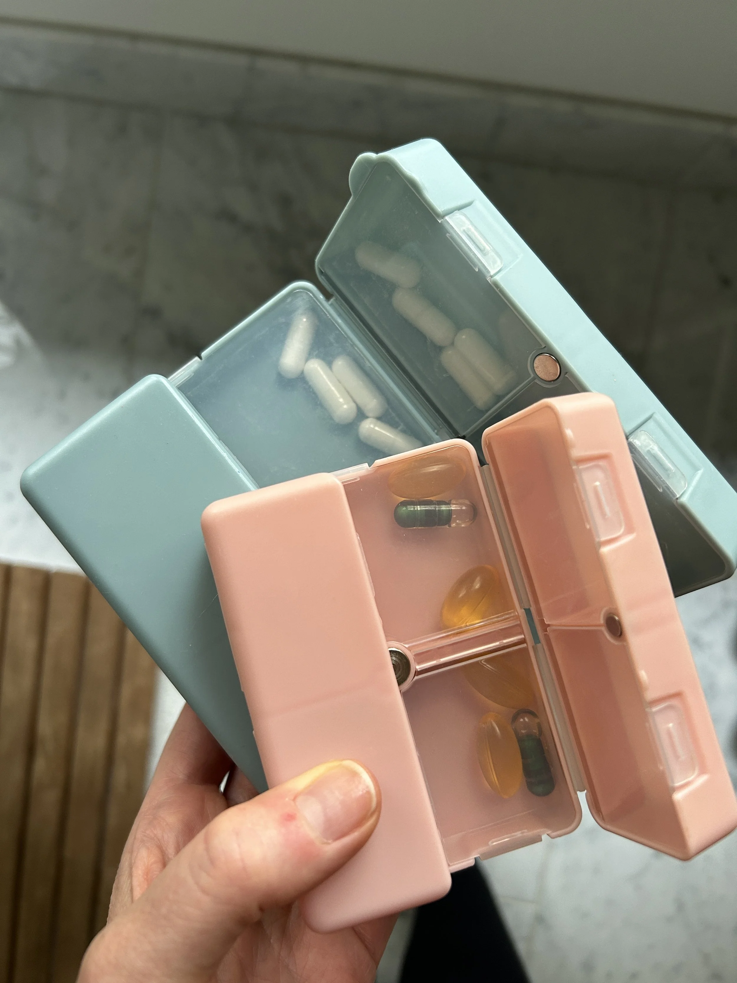 Rather than a bunch of bottles, boxes of sachets shoved in a cupboard, put them out on your kitchen counter, in a way that feels good to you, where you will see them to queue “take my supplements.” And also, easy to grab to pop what you need in your bag if you’re heading out for the day.