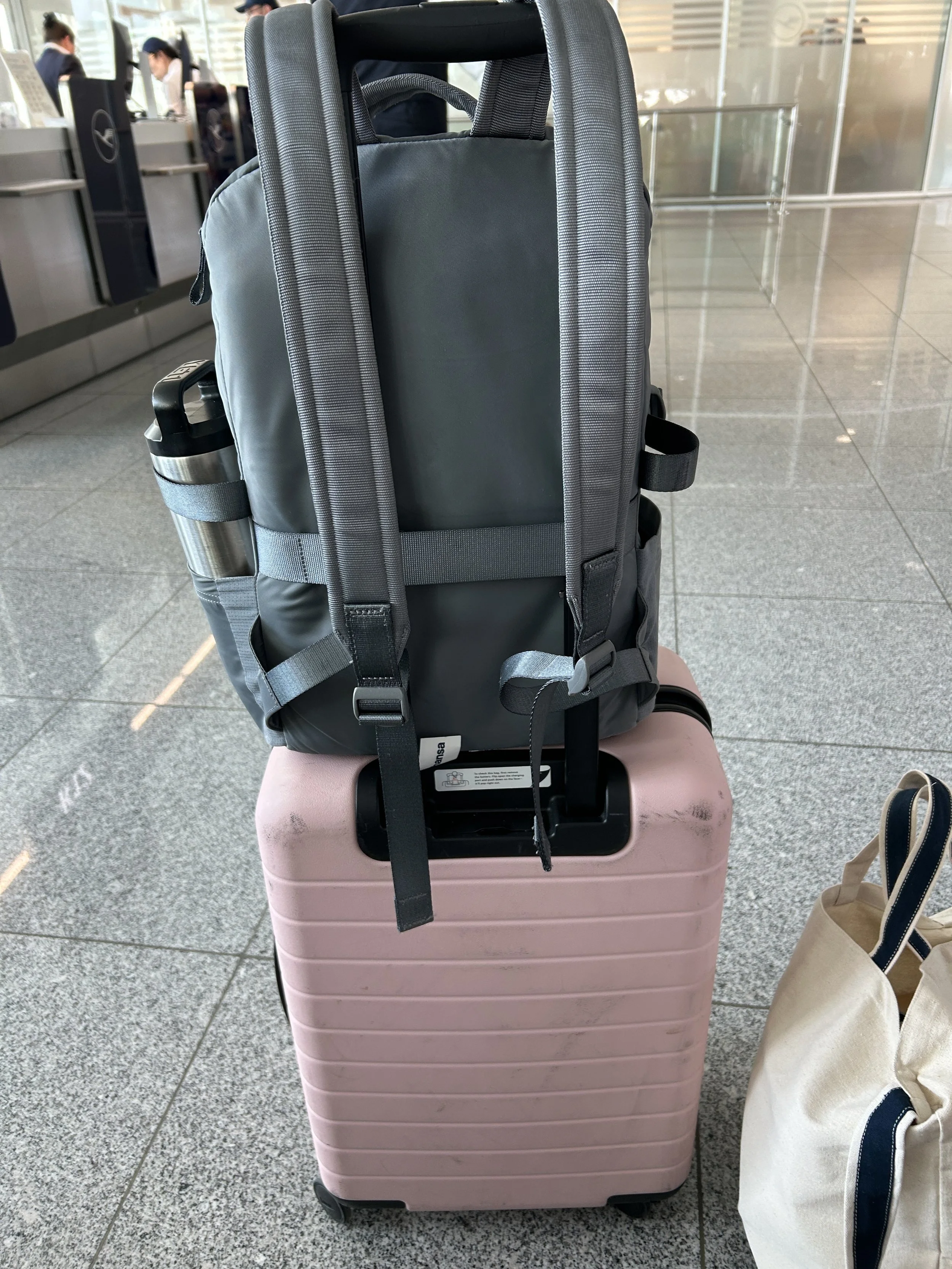 Backpack with a strap to sit on my carryon bag. I have the lululemon backpack and love.